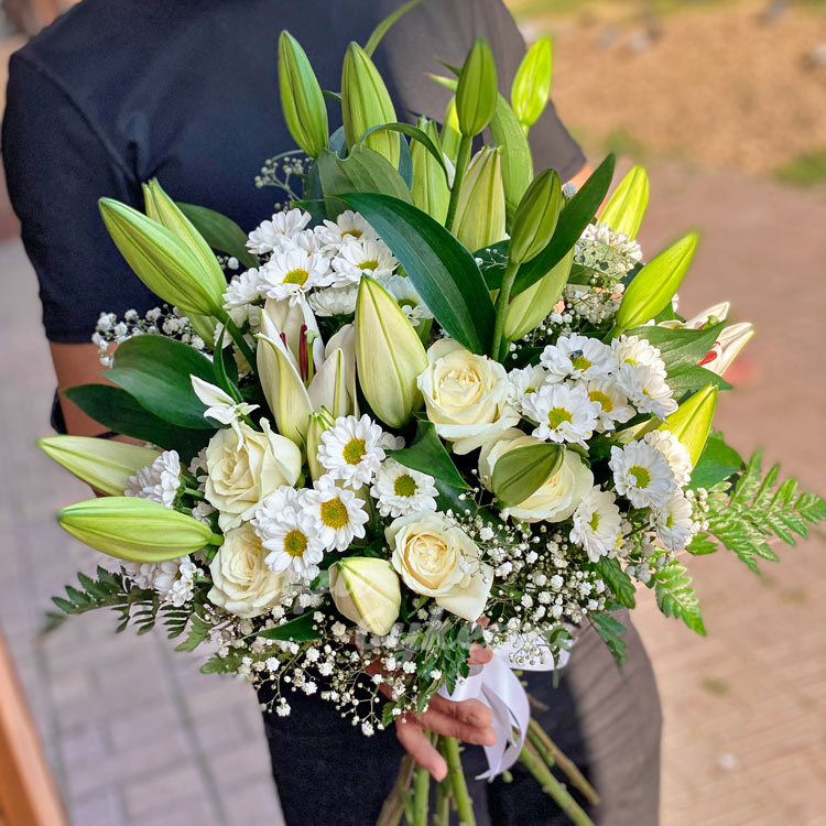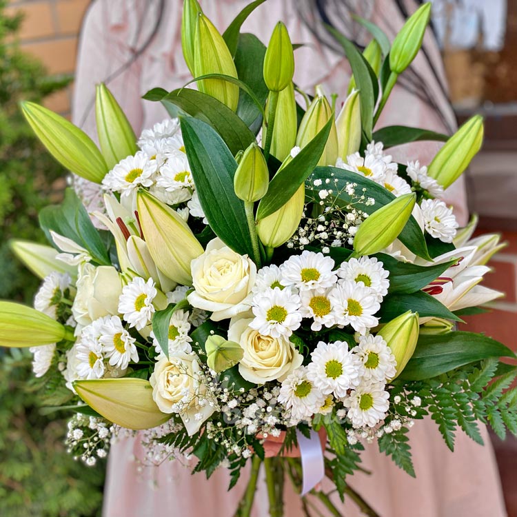 Букет белых лилий, хризантем и роз