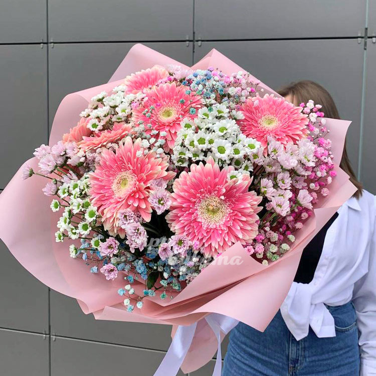 Букет гербер, хризантем и гипсофилы
