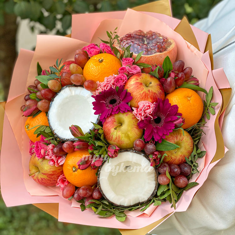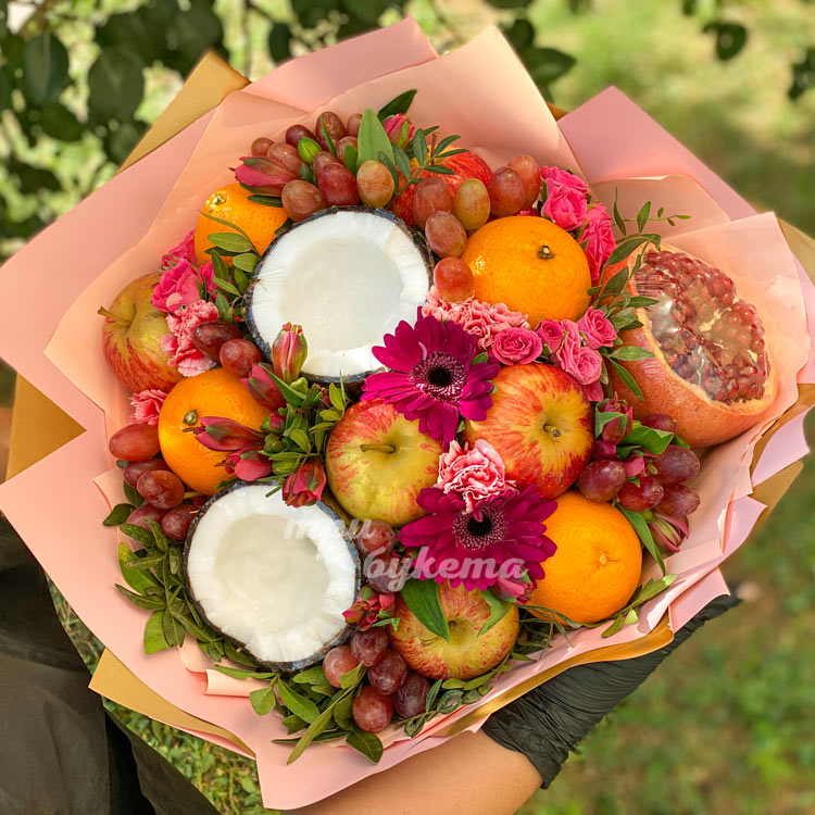 Букет из апельсинов, яблок и цветов