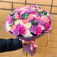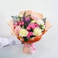 Букет розовых роз с зеленой гортензией