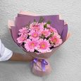 Герберы и хризантемы в розовом сизале