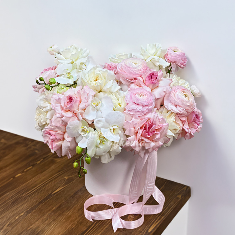 Коробка роз, ранункулюсов и орхидей