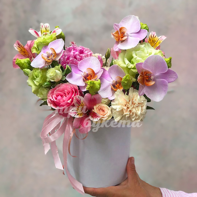 Коробка розовых орхидей с эустомами