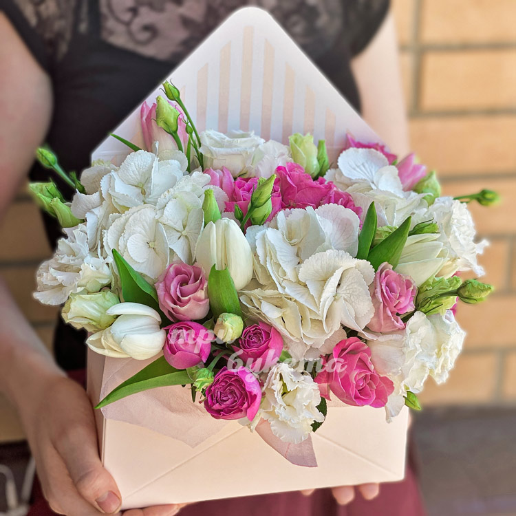 Коробочка с тюльпанами и гортензией