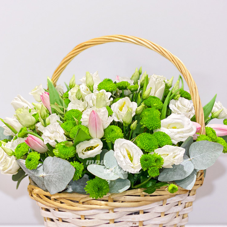 Корзина белых эустом и зеленых хризантем