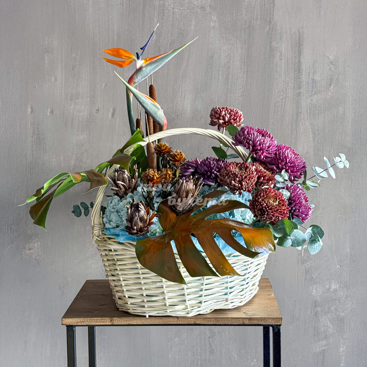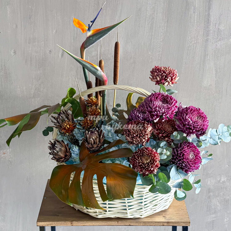 Корзина гортензий и экзотических сухоцветов