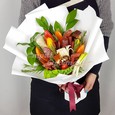 Корзина с белыми эустомами и фруктами