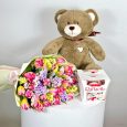 Набор из мягкой игрушки, шариков, конфет и 15 красных роз
