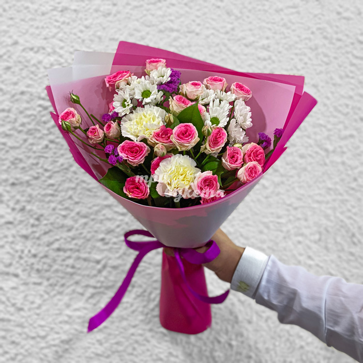 Розовый букет кустовых роз и хризантем
