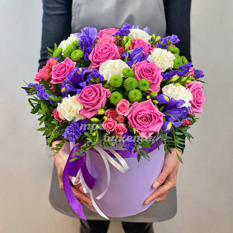 Шляпная коробка роз, ирисов и гвоздик